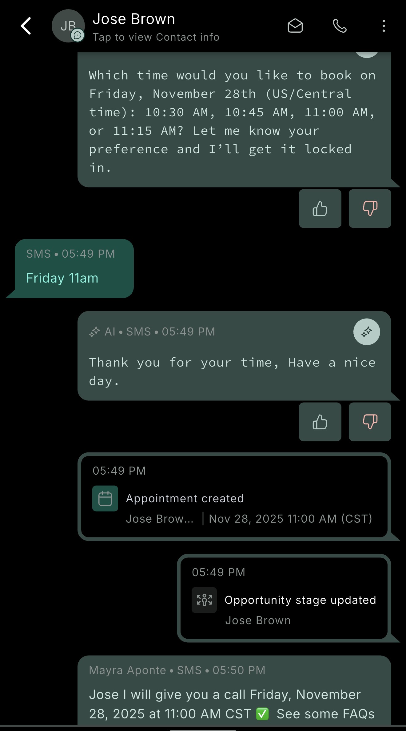 AI Agents calls and texts new leads within seconds before your competition does and can receive calls while you are away.